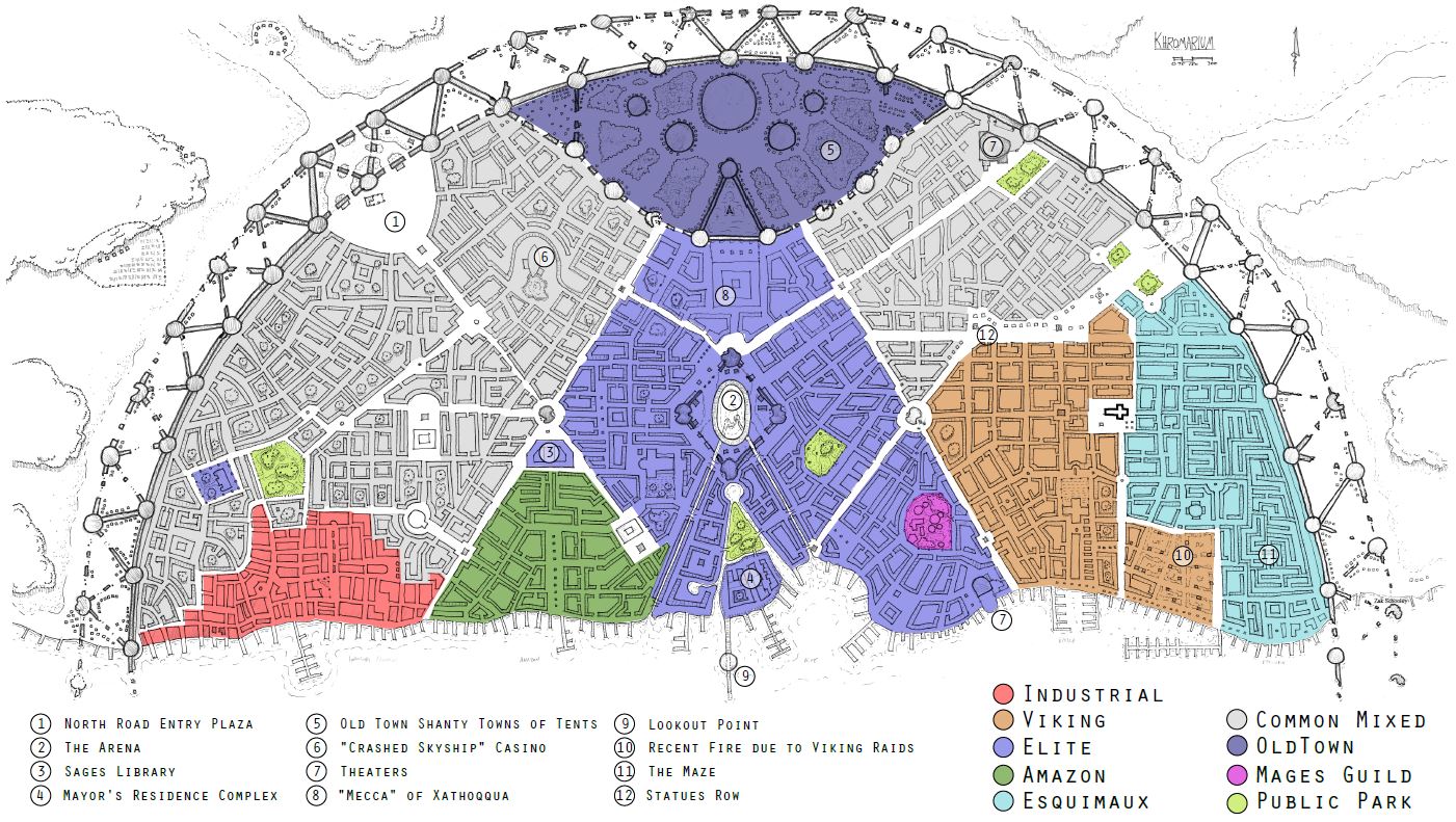 Here is a diagram with how I was also thinking the city was organized and a few of the key points referenced.